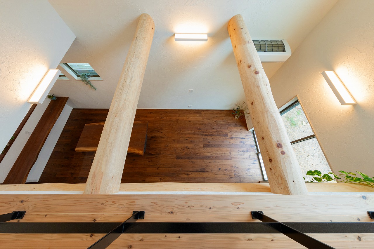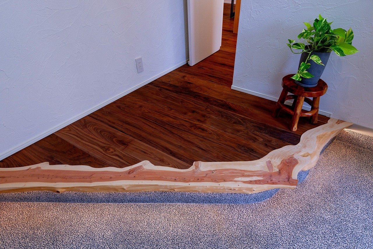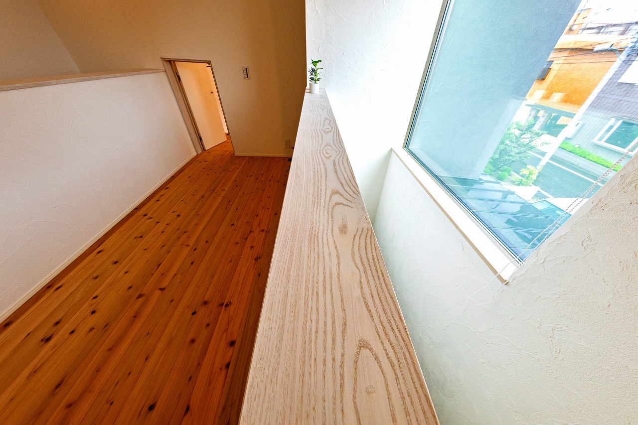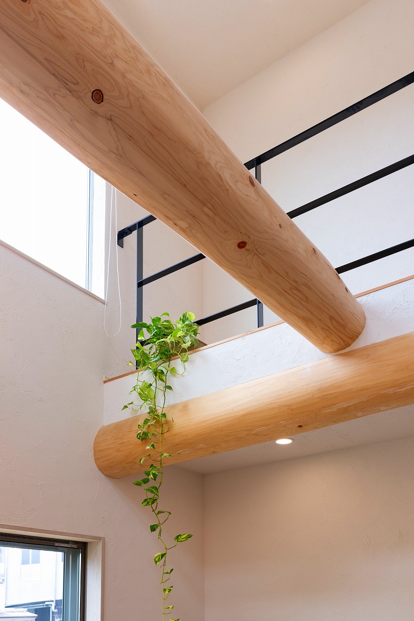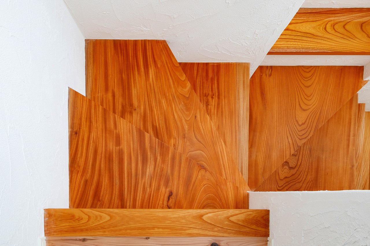 光と木のぬくもりを感じるケヤキの階段と漆喰の壁の家