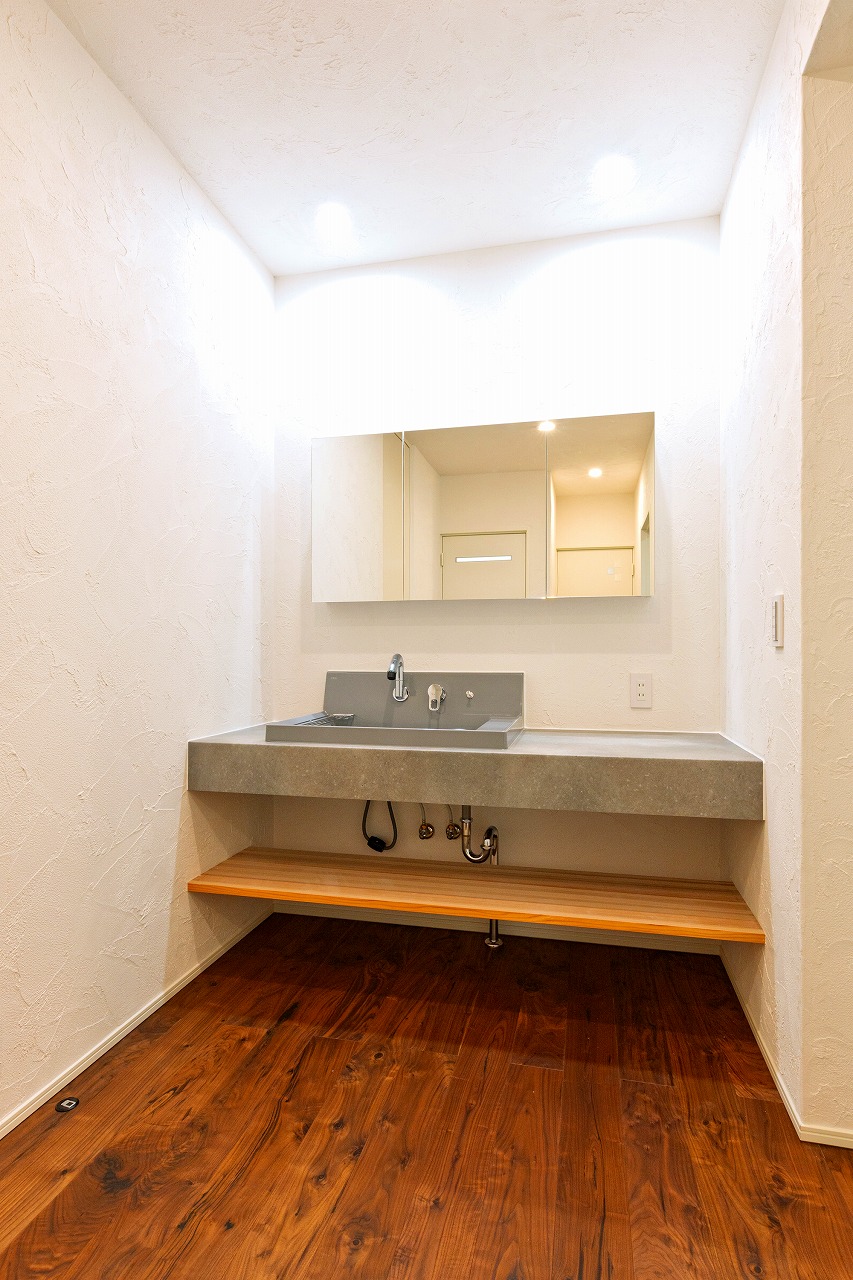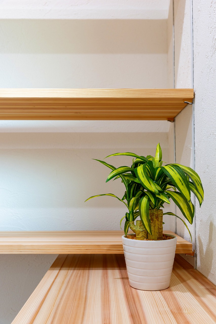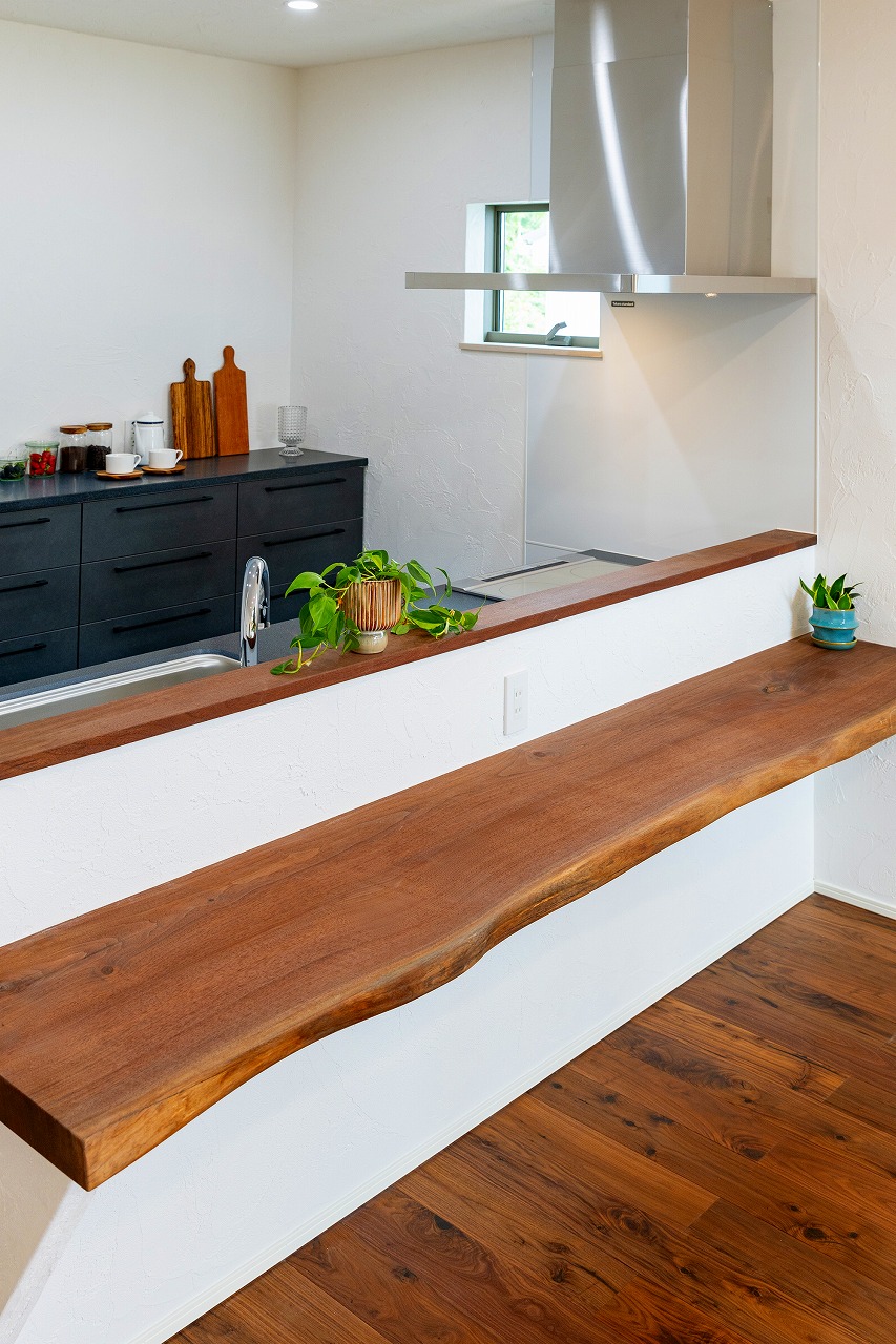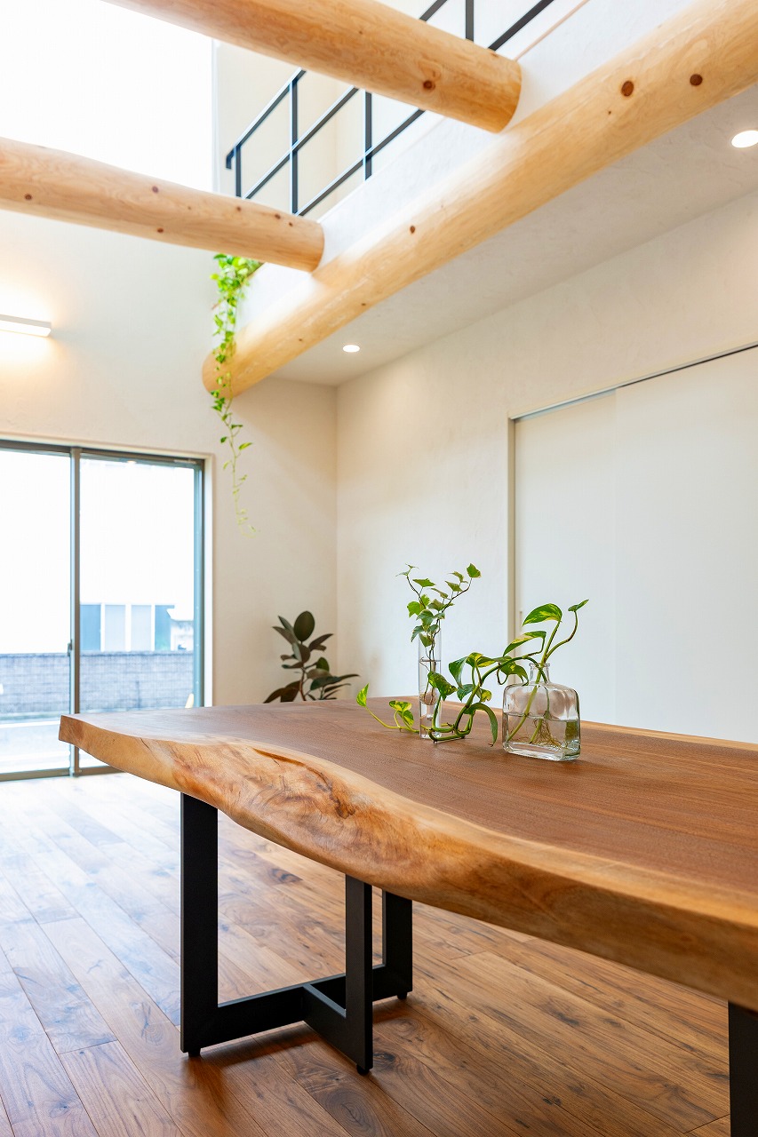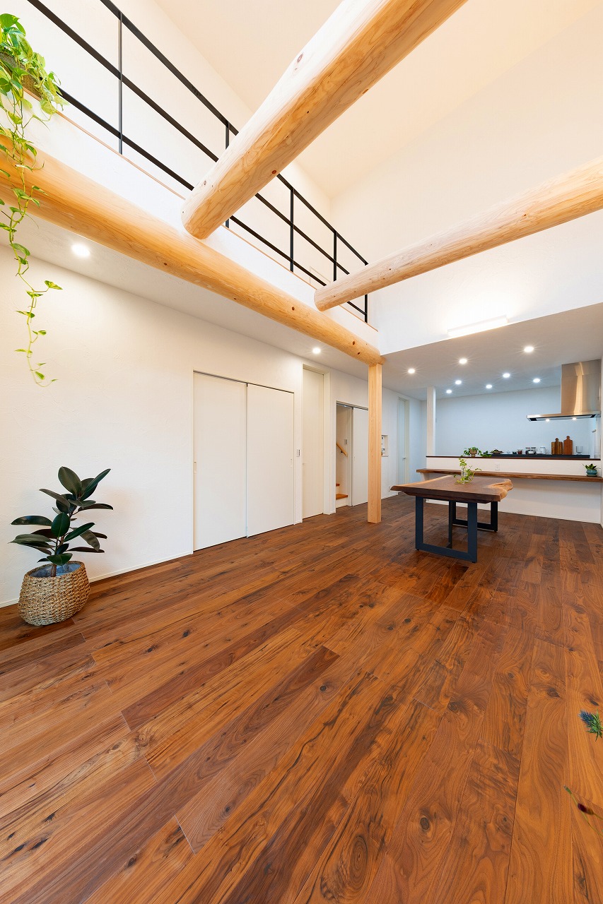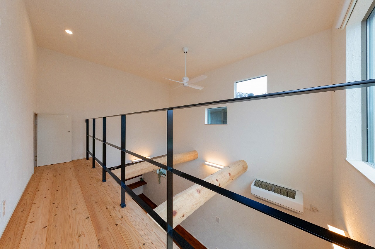 光と木のぬくもりを感じるケヤキの階段と漆喰の壁の家