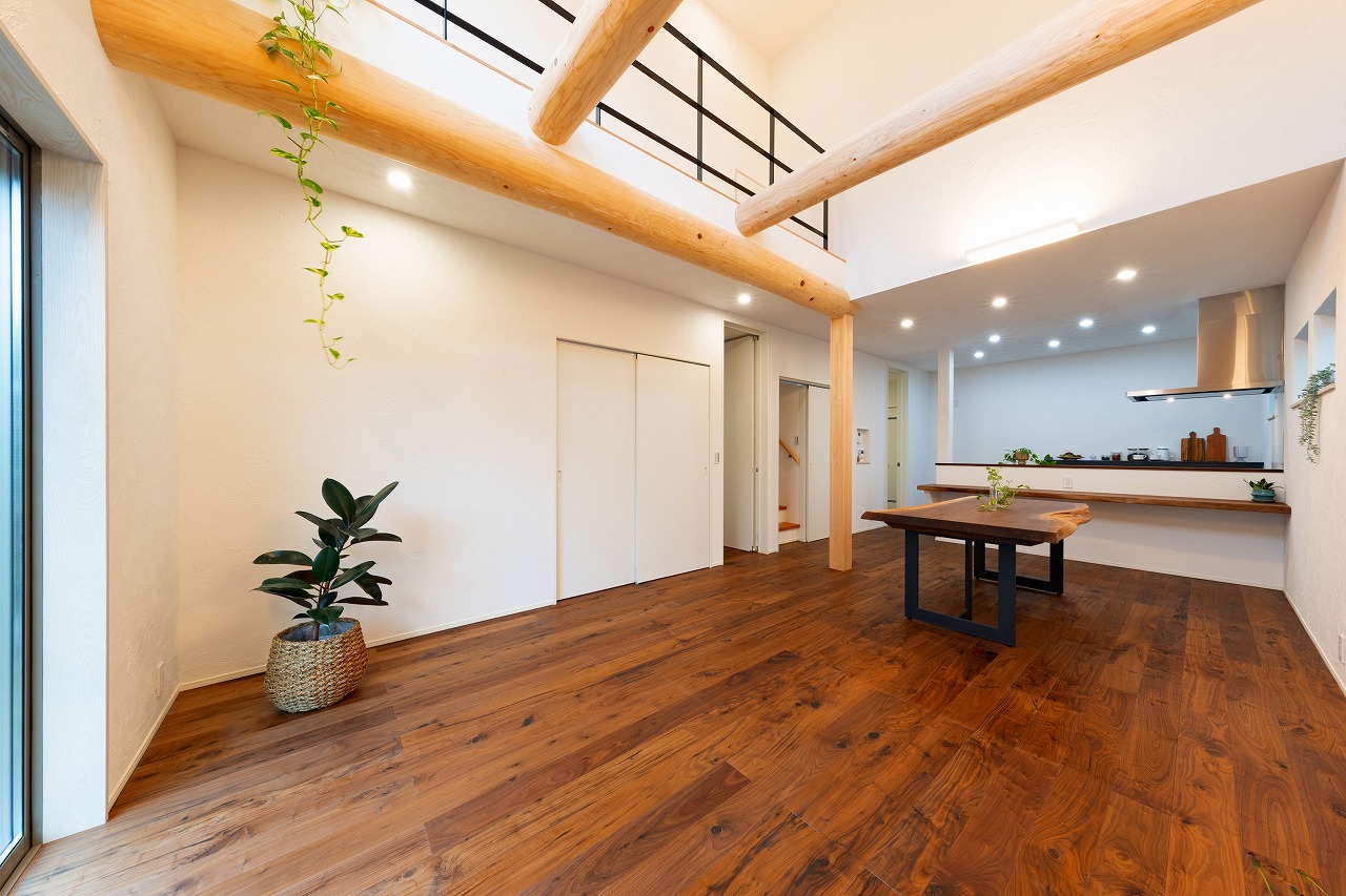 そして約一年後、僕たちのマイホームが完成!玄関の框をはじめ床板やテーブルなど、マツシマ建築さんらしく木を随所に感じられる家になりました。なかでもこだわったのはリビングの吹き抜けに通してもらったむき出しの丸太。開放感がありながらぬくもりを感じられ、我が家の象徴的な空間になりました。